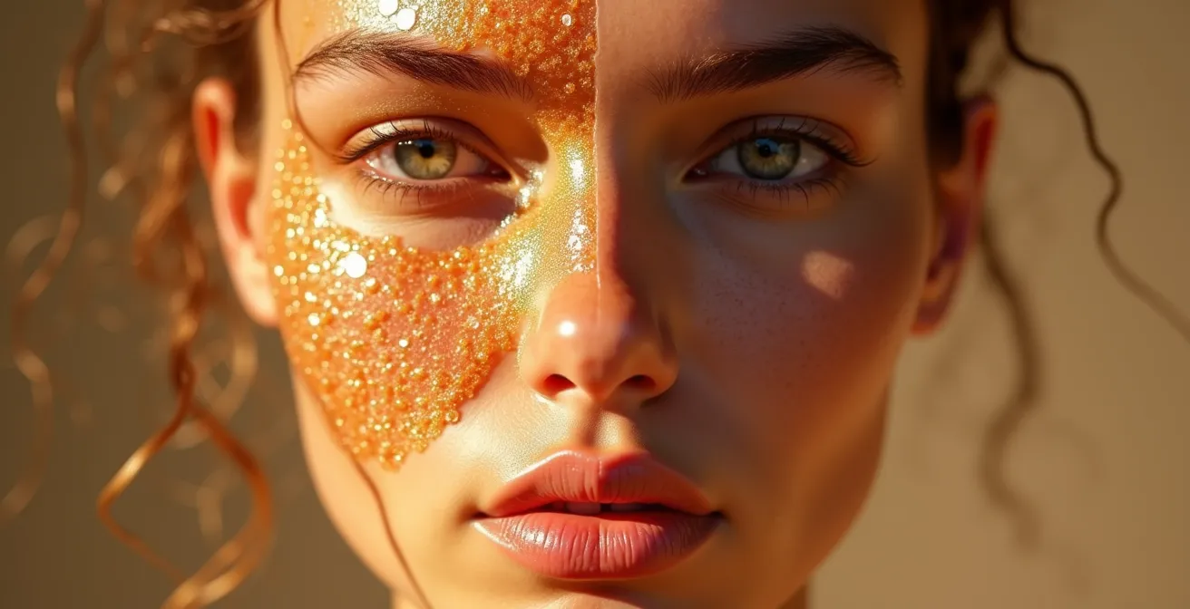 Face à un teint terne, le premier réflexe est souvent d’exfolier, parfois avec acharnement, dans l’espoir de « décaper » la couche grise pour révéler une peau neuve. C’est une erreur fondamentale, surtout sur une peau affectée par la glycation. Une peau glycquée est déjà dans un état d’inflammation chronique de bas grade. Le sucre favorise l’inflammation, et les AGEs fragilisent la barrière cutanée. Utiliser des gommages à grains agressifs sur ce terrain sensible ne fait qu’aggraver la situation : vous créez des micro-lésions, vous déstabilisez le film hydrolipidique et vous stimulez une réponse inflammatoire encore plus forte. Le résultat ? Une peau encore plus réactive, rouge et, paradoxalement, plus terne et grise, car elle se défend en s’épaississant.